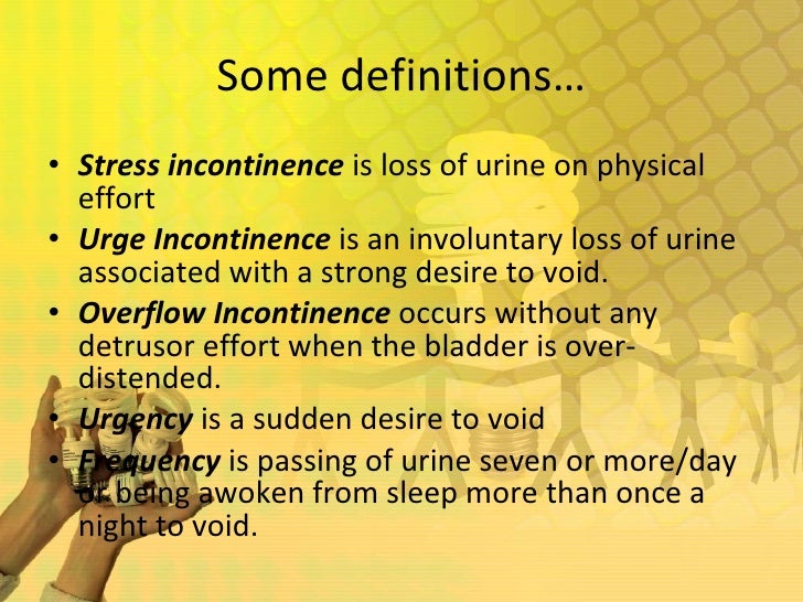 Incontinence is a loss of bladder control, often leading to uncontrollable urine leakage. Overflow incontinence happens when the bladder is unable empty completely. Overflow incontinence is the involuntary release of urine—due to a weak bladder muscle or to blockage—when the bladder becomes overly full, even though the person feels no urge to urinate. While it is typically a small amount that is leaked.